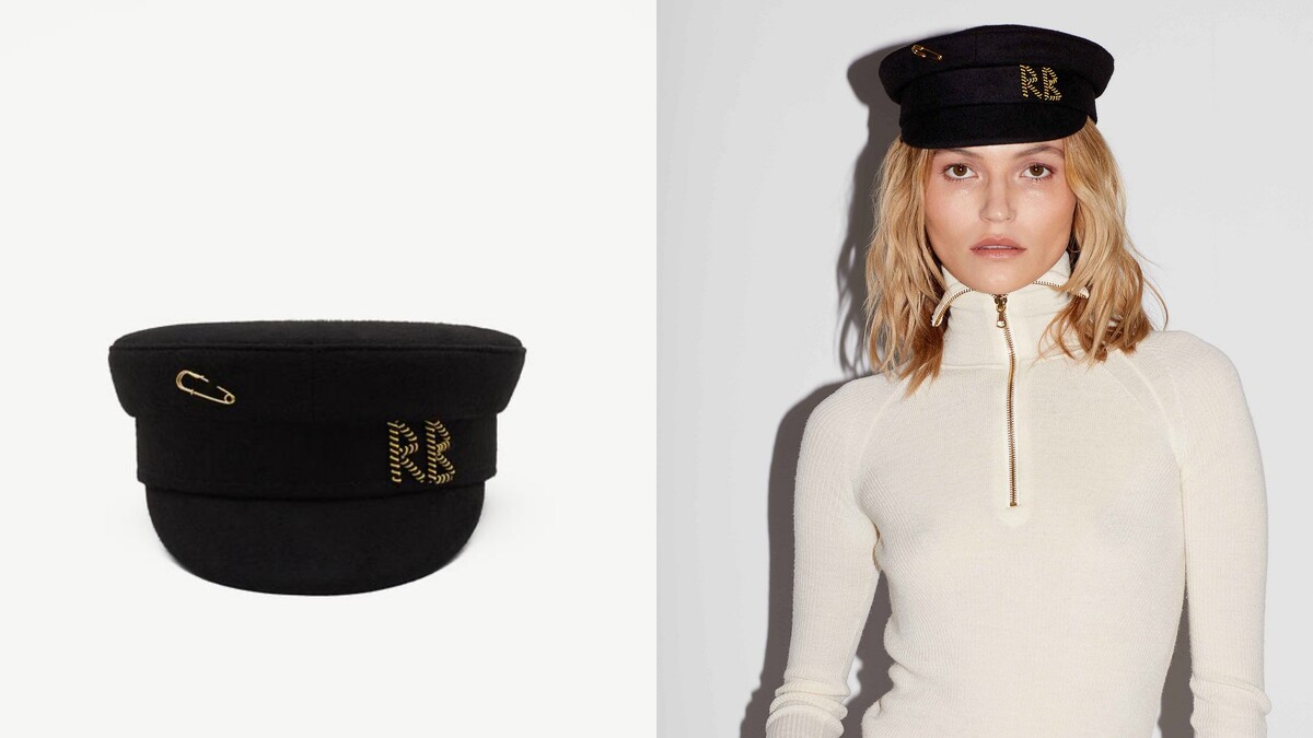 基本款的黑色軍事報童帽,推薦給初次選購Ruslan Baginskiy帽子的女孩們。黃色條紋的RB logo裝飾,帽頂邊緣處還有一個金色別針點綴,雖說是基本款也不覺得單調。