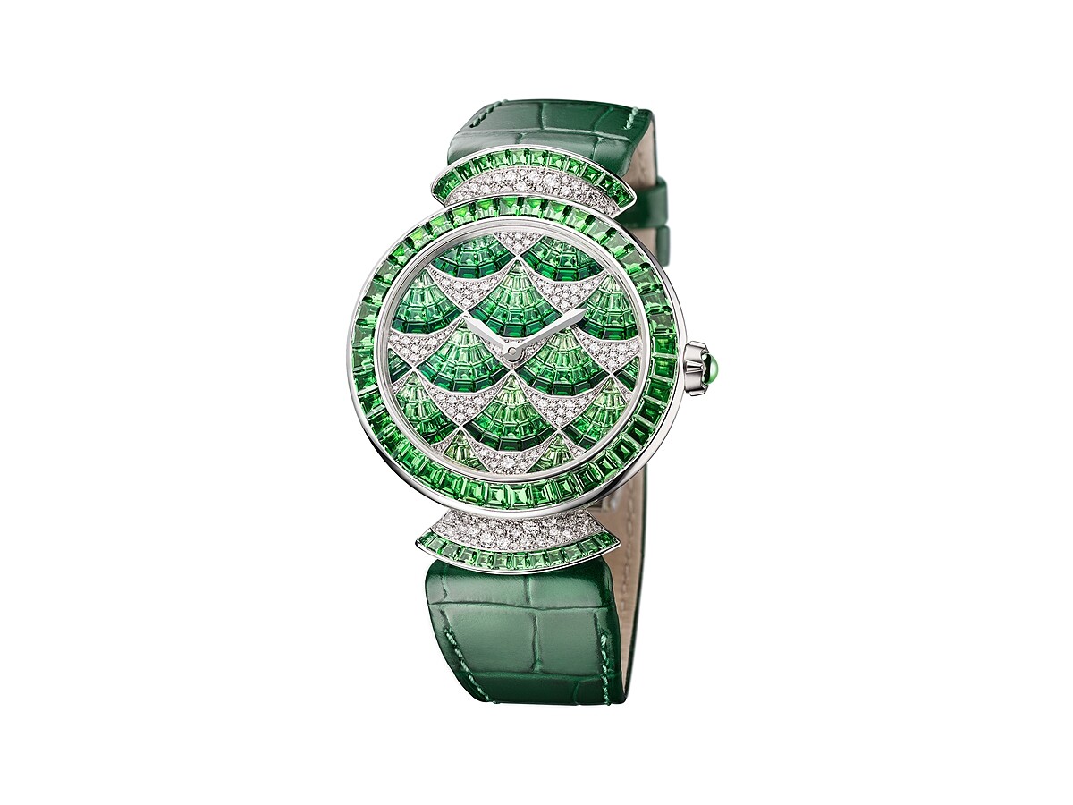 BVLGARI DIVINA MOSAICA珠寶腕錶 沙弗萊石款 寶格麗自製機械式自動上鍊機芯BVL 191,小時與分鐘顯示,防水深度30公尺。 錶徑37 MM,白 K 金錶殼,鑲嵌明亮切割鑽石、錶圈鑲嵌長方形切割沙弗萊石、錶帶與錶耳鑲嵌明亮切割鑽石與長方形切割沙弗萊石;白 K 金錶冠鑲飾蛋面寶石切割沙弗萊石。白 K 金錶盤鋪鑲長方形切割沙弗萊石與明亮切割鑽石,排列鑲嵌成卡拉卡拉浴場馬賽克扇形圖騰。鑲嵌282顆鑽石(總重約2.16克拉)與261 顆沙弗萊石(總重約11.6克拉)。 綠色鱷魚皮錶帶,搭配白 K 金折疊式錶扣,鑲嵌長方形切割沙弗萊石。 參考售價:約新台幣4,955,000元