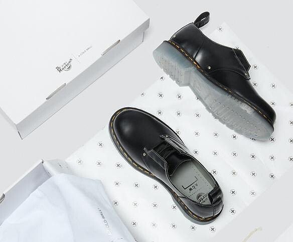 而這一雙聯名鞋最大的亮點便是鞋底之處,一抹靜默的半透明冰晶藍,是Dr. Martens少見的高冷感。