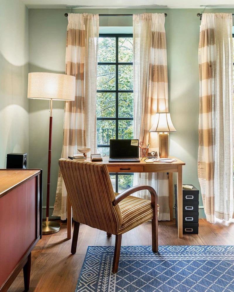 房間本身參照2000年時期的所製作的《慾望城市》都會風格,相連在一起的客廳與臥室以淡雅的淡綠色粉刷,搭配著許多木質傢俱,窗邊還設立了一個小書桌,如同凱莉在劇中寫作、沉思的小角落,還能一邊欣賞紐約的街景。