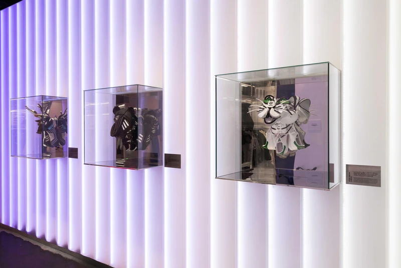 Brand Center是目前愛迪達最高規格的店舖規模,如果只是以大量的商品填補商店空間,又稍嫌單調。因此,adidas邀請了當地的藝術家,來幫忙Brand Center規劃在地獨有的裝置藝術。本次在信義區的概念店邀請了2位台灣藝術家——1F一進門左手邊的天花板上,吊著一座藍色紗線織成的雕塑品,是由李霽所做,象徵著adidas為永續時尚的承諾。