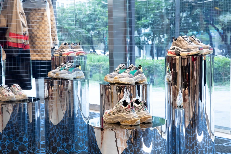 融合Gucci創意總監Alessandro Michele和Balenciaga創意總監Demna Gvasalia的設計美學,特別在Gucci新光三越A4店鋪中,運用極具未來感的鏡面拼貼、幾何柱體打造店中店,圍繞著圓型柱體的純白色LED燈管,還有腳下吸睛度十足的雙G Logo黑藍地毯,充分展現出駭客實驗室想呈現的前衛意象。