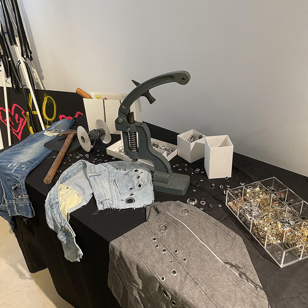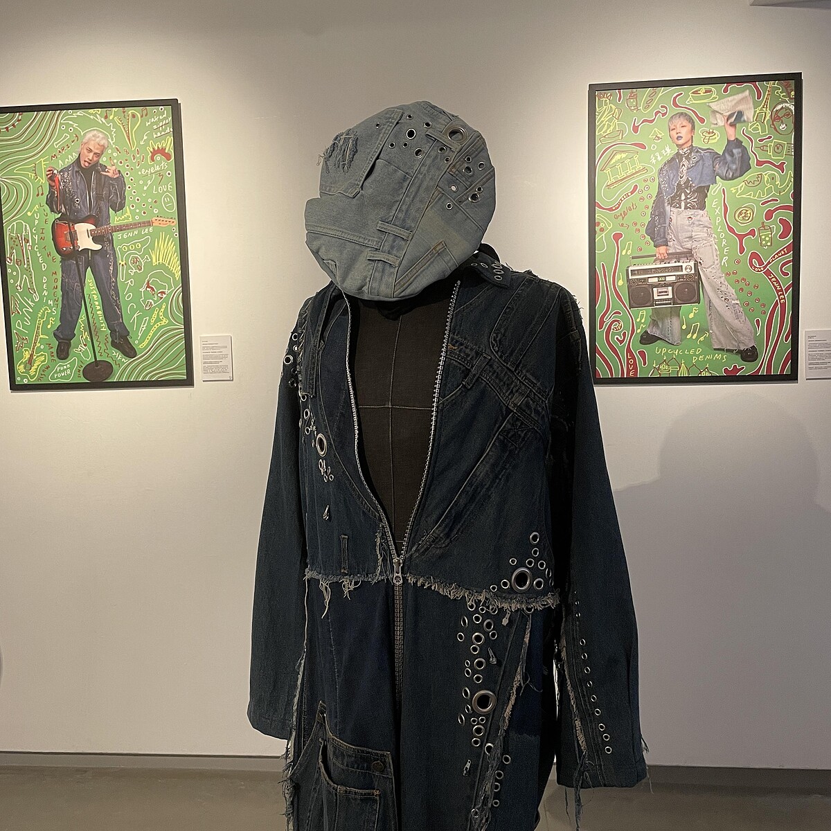 透過社群平台的號召力,Jenn Lee向粉絲們收集了不再穿的丹寧服飾,將這些回收衣物剪裁、拼接,並手工釘上金屬雞眼,展現出品牌一貫的反骨個性。