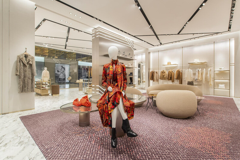 改裝後的Fendi信義微風店,變得更加明亮、透徹,全景落地玻璃窗,在周圍加上金屬邊框,營造出未來、元宇宙科技的質感。店裡頭所見的展示櫃、桌面也都有相同的材質呼應。