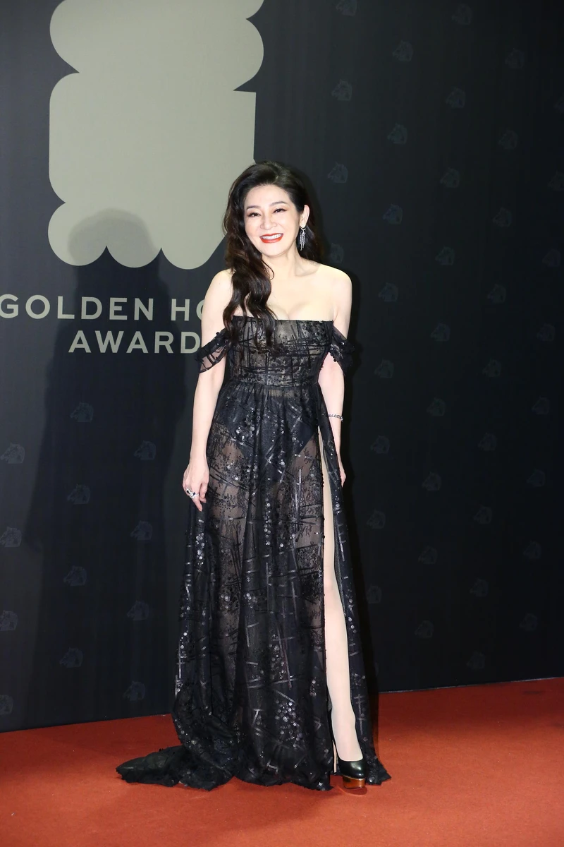 太令人佩服!彩樺姐的保養術太驚人,宛如少女的玲瓏曲線,一字領的透膚黑色禮服展現自己對於金馬的最大誠意。