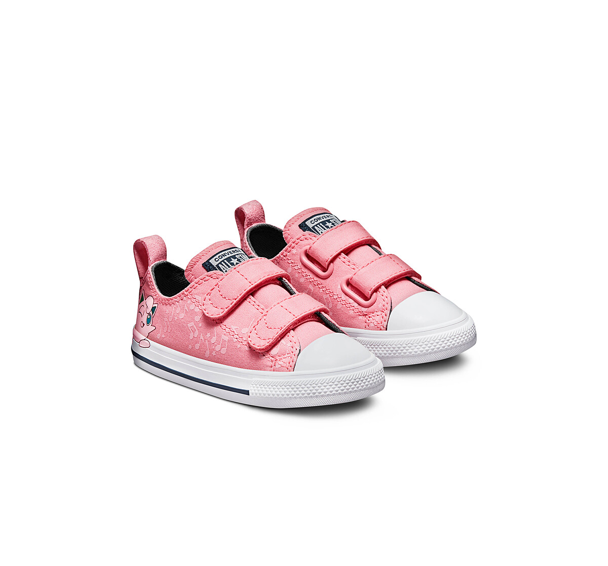 寶可夢所有人氣角色躍上All Star,一邊有皮卡丘、傑尼龜、小火龍、妙蛙種子,另一邊則是一唱歌就有催眠效果的胖丁和寶貝球圖案,鞋舌處印有Pokémon標誌,兩旁的鞋帶穿孔特別以寶貝球配色呈現,值得一提的還有Converse在鞋內側的圓形標誌,此次也特別作成寶貝球配色,提供成人、青少年和嬰幼兒三種尺寸。
