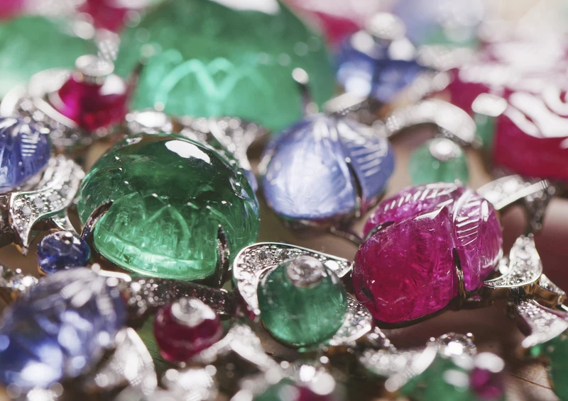 技術資料:鉑金,兩顆來自莫三比克的六角形雕刻紅寶石,總重90.92克拉,四顆來自尚比亞的凸圓形切割祖母綠,總重 41.02 克拉,雕刻紅寶石、藍寶石和祖母綠,紅寶石、藍寶石和祖母綠寶石珠和紅寶石,明亮式切割鑽石。參考價格約NT$ 109,500,000