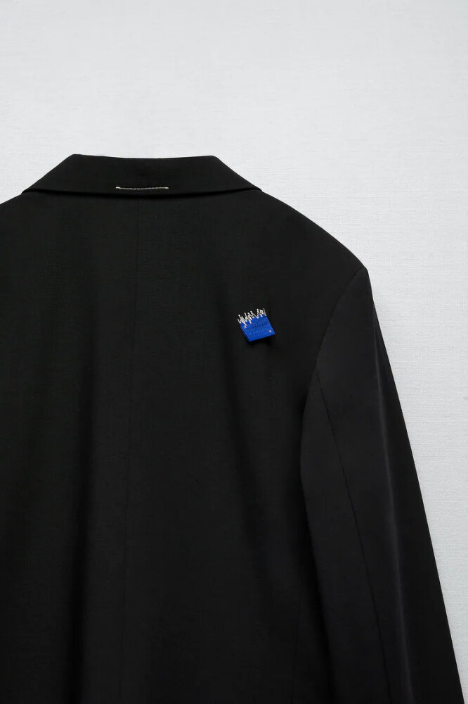 翻到背面,可以看到Ader Error標誌性的藍色縫線標籤,衣襬之處另有本次聯名「AZ」縫線裝飾。這件外套編輯私心認為最美的細節,在於其肩線的剪裁,筆直又俐落的直角肩,盡顯時髦氣場。