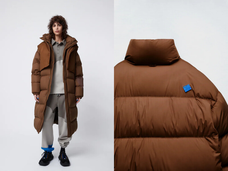 巧克力色的羽絨長版大衣,Ader Error在外再加上一層焦糖色的短版背心,營造出層次感。兩件外衣可以相互搭配,也可以拆卸、分別另做其他造型。
