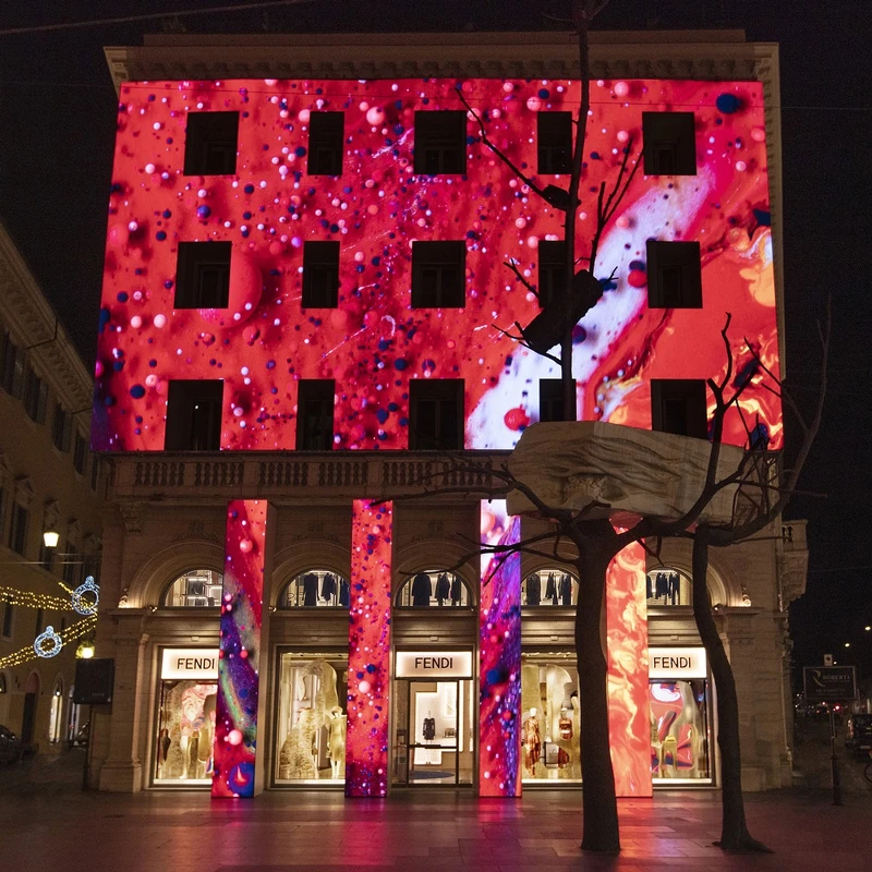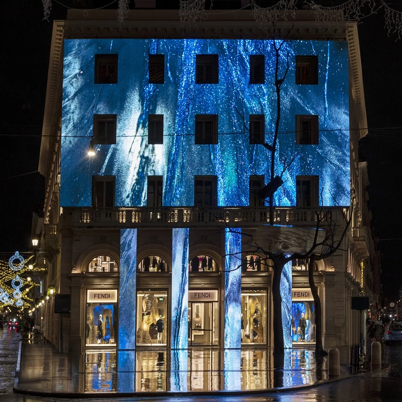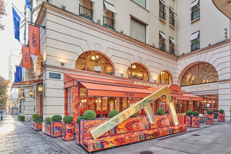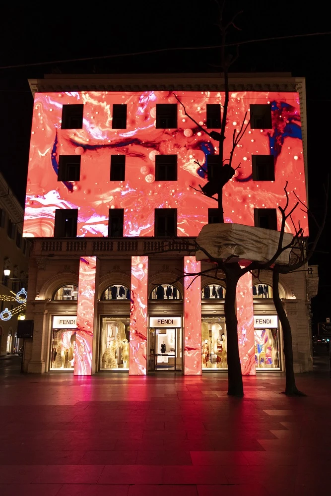 在東京表參道的Fendi店舖入口處,擺放上一座紅色大理石底座的「F」字母雕塑,話題咖啡店Fendi CAFFE by ANNIVERSAIRE也換上聖誕節的代表色;中國上海恒隆廣場期間限定店、北京SKP店同樣能看見大理石傢俱、擺設;首爾現代百貨Fendi男裝店則鋪滿藍灰色大理石花紋圖案。
