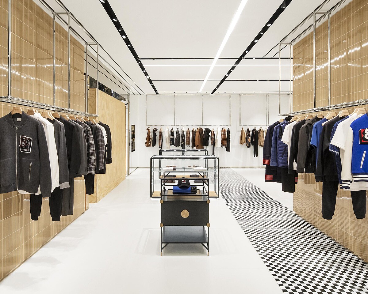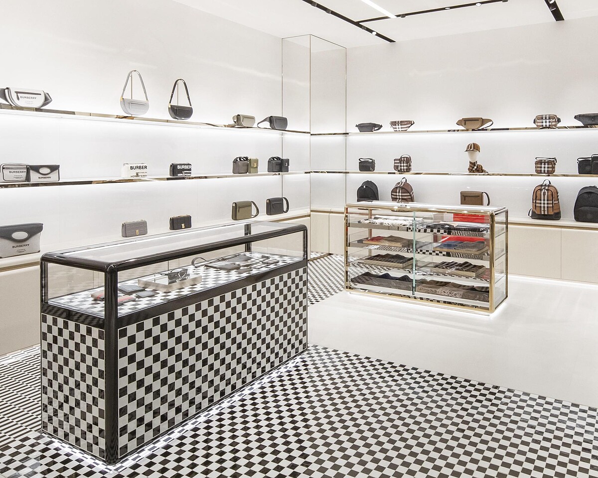Burberry經常用到黑白、蜜金配色在服飾上,本次的男裝店也忠於品牌設計特色,在地面、牆壁都能看見這樣的元素。在不能出國的日子裡,還是可以享受到和倫敦一樣的購物氛圍!