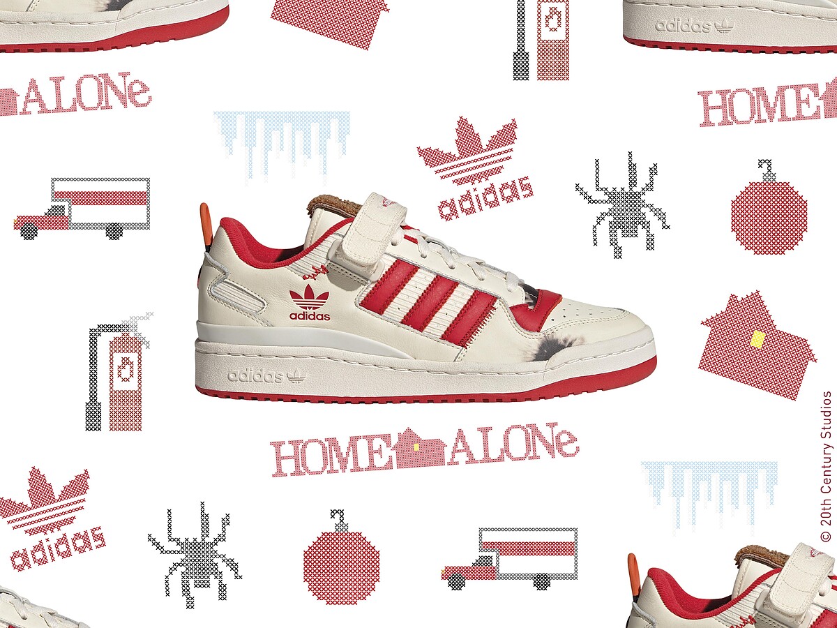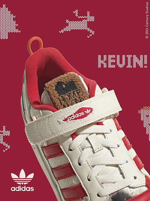 adidas Originals X小鬼當家耶誕聯名系列以經典球鞋Forum Low出發,將電影主角凱文與反叛二人組哈利和馬文相遇場景為題,選擇奶油白色系打造鞋身,並以應景聖誕節的紅色點綴三斜線、鞋底以及鞋內側,鞋身上還原了電影的經典火燒痕跡。