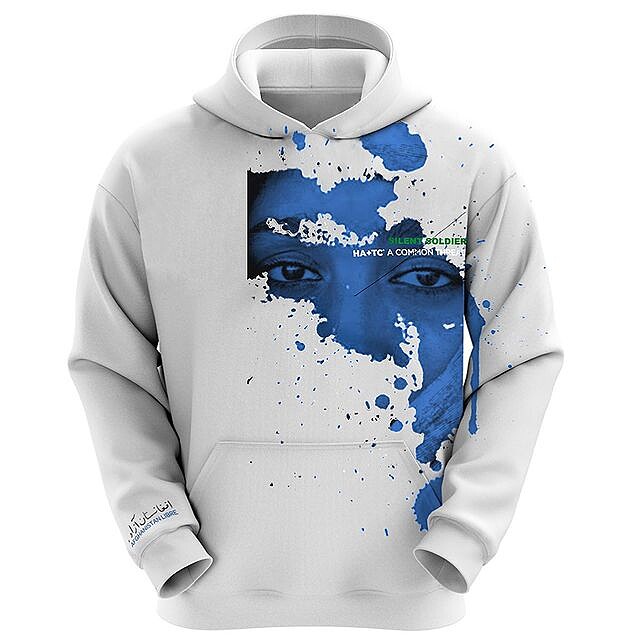 聯名公益帽T,以白色為底,藍色的潑墨圖樣中藏著一個阿富汗少女無助的眼神,雖然只是2D的圖像卻格外發人省思。帽T每件售價175歐元、約NT$5,500,有興趣的大家可以透過下方連結了解更多資訊與購買。