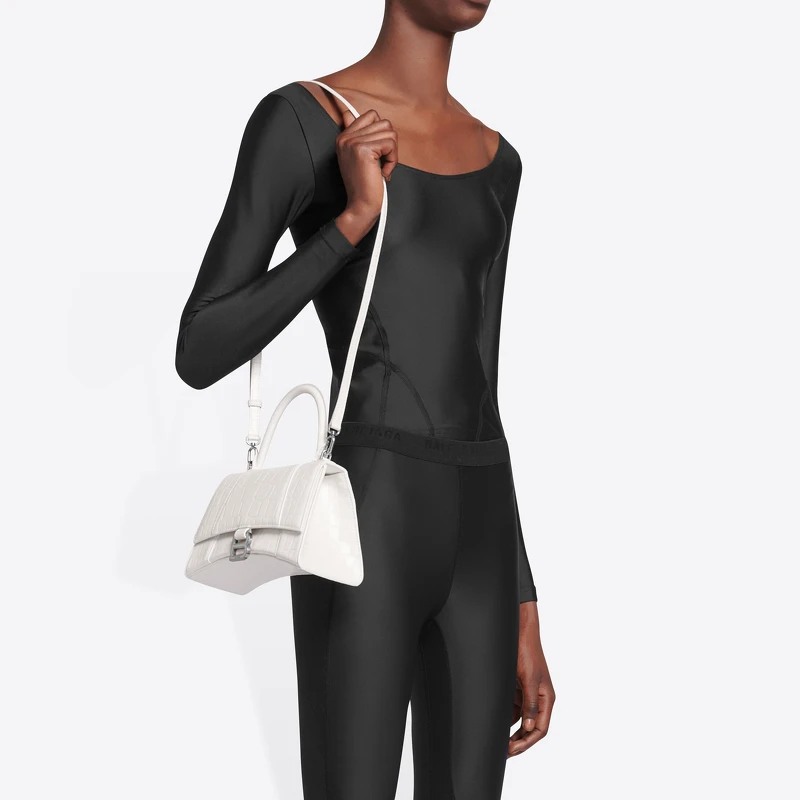 以品牌最著名的巴斯克腰線BASQUE-WAIST外套的沙漏曲線為靈感打造的HOURGLASS包款,擁有牢固的懸掛結構設計,平放在桌面上,包身底部會呈現出半月形空間,搭配金屬B字磁釦、手提把設計,可以作為手拿包,或是搭配可拆卸背帶斜背使用。