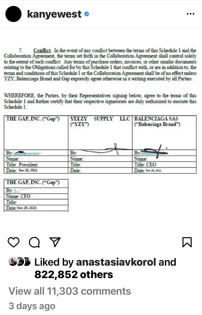 與其搶先亮出聯名設計,Kanye West選擇直接公布合作契約,透過文字內容讓粉絲們自行體會這一項破天荒等級的聯名計畫。