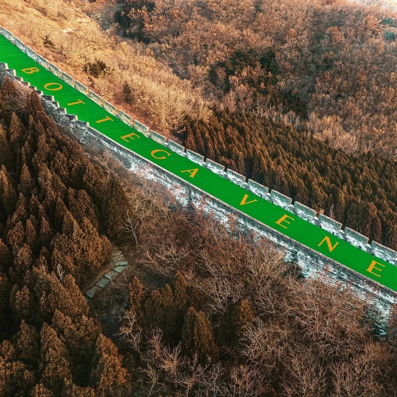 Bottega Veneta在這幾個月以來的企劃不斷在突破品牌極限,聖誕節之際所推出的《Bottega for Bottegas》,大舉將牆面廣告粉刷成選物單元,與時尚迷分享義大利的美食與美酒,除了懂時尚也懂生活。而迎來農曆春節,Bottega Veneta這一次直接前往中國長城,大手筆包下山海關地段,並鋪上數公里長BV綠!