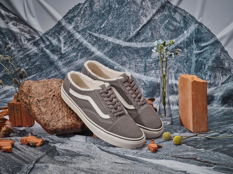 Vans經典滑板鞋Old Skool,保留鞋身上的鞋帶設計,特別把鞋後跟挖空,搭配質感的霧灰幾皮面料,加上溫暖的內刷毛材質,怕冷一族的鞋櫃中務必收藏。