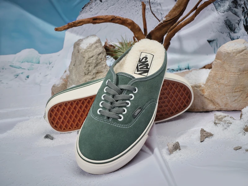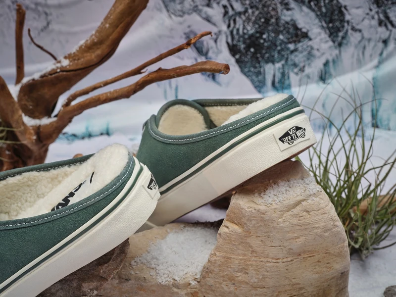 經典滑板鞋Authentic改以方便穿脫的穆勒鞋登場,搭配活潑的嫩綠色麂皮材質,微露在外的毛絨絨材質,為秋冬穿搭增添可愛氣息。