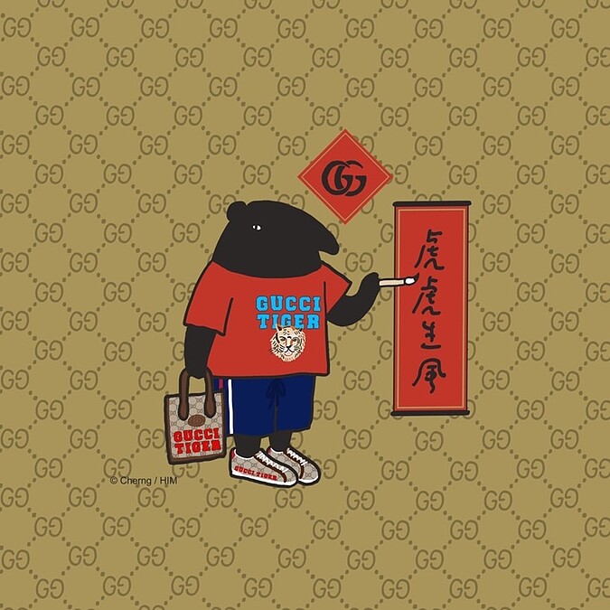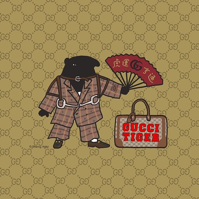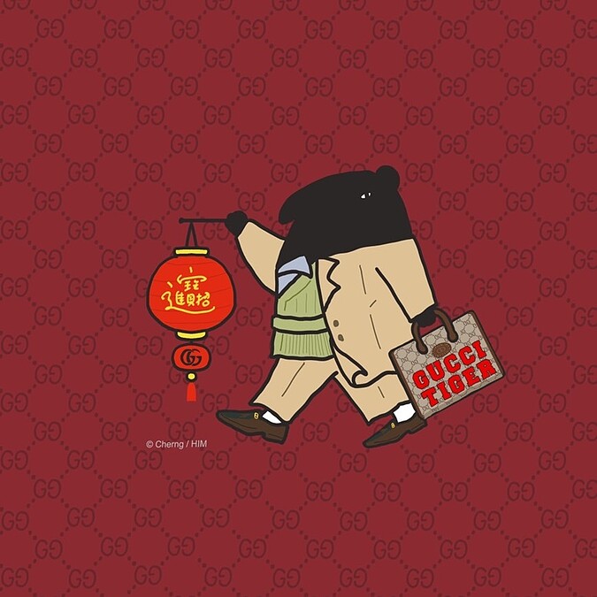 Gucci台灣官方Line帳號推出與插畫家Cherng聯名系列第二彈,歡慶農曆新年到來,Gucci再與Cherng攜手合作,將馬來貘LAIMO穿上Gucci Aria系列和虎年新春系列服飾、配件,設計虎虎生風、虎運亨通、招財進寶共3款開運桌布。