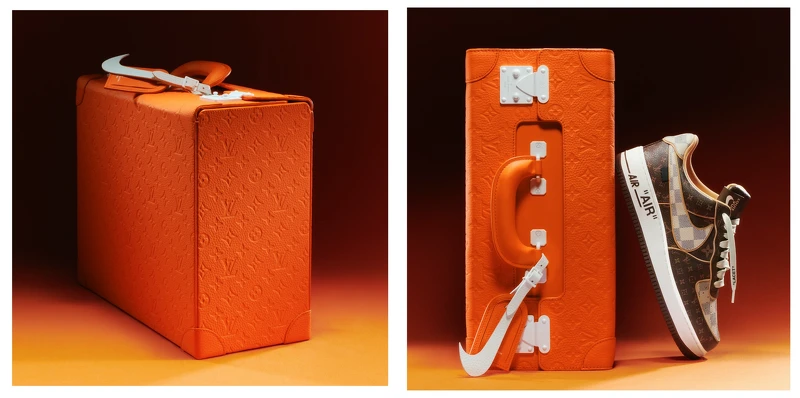 每一雙聯名老花Air Force 1會附上一個手提行李箱,沿用Nike的橘色鞋盒顏色,上面刻印了Louis Vuitton經典老花,並掛上白色Swoosh勾勾吊飾,兩方品牌的招牌設計相得益彰。