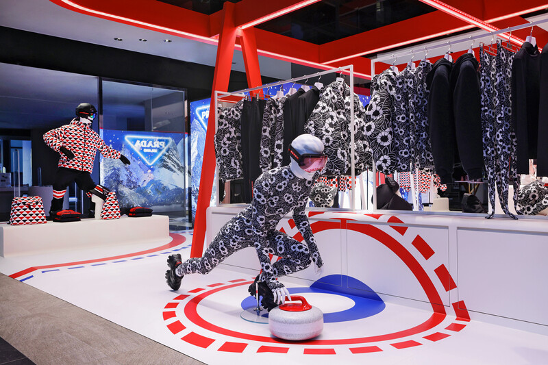 遠遠一看就能見到寫著Prada的紅色LED燈條在滾動,把從冰球場的紅藍圖案鋪設成雪白地板,化為運動賽場看台區的商品陳列區,以及圍繞著Prada On Ice期間限定店擺出經典滑雪姿勢的人台模特兒,每走到一處都能發現品牌滿滿的巧思與驚喜。