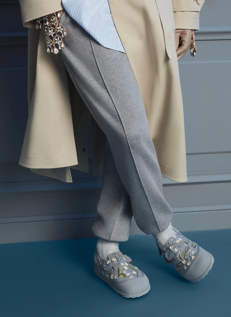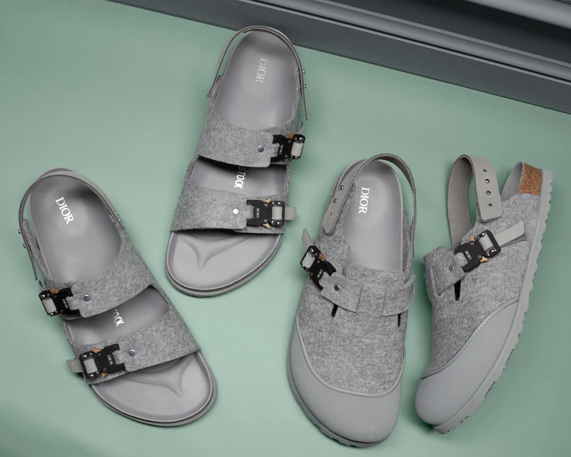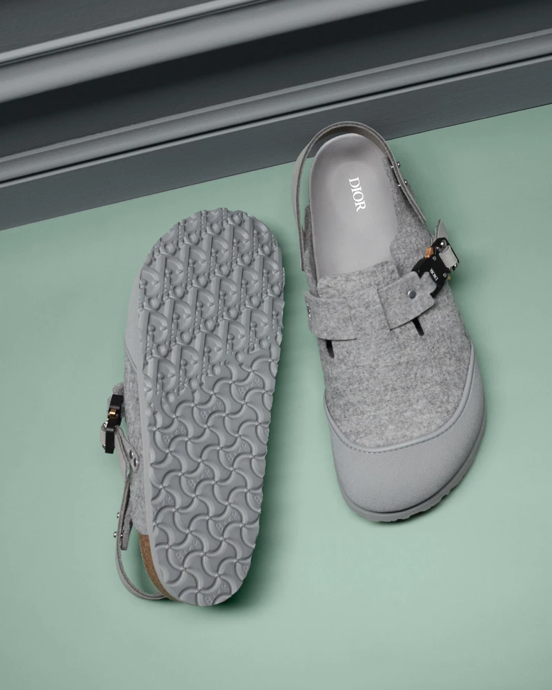 男裝創意總監Kim Jones從迪奧先生情有獨鍾的特里亞農灰出發,加入Dior標誌性的Oblique老花圖案,而Birkenstock涼鞋原有的釦環也換成Dior金屬工業釦,當然,Kim Jones也沒錯過鞋底設計,一半是Oblique老花圖案一半則為Birkenstock Logo。