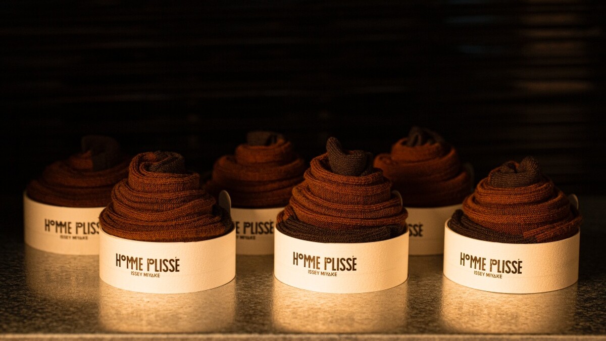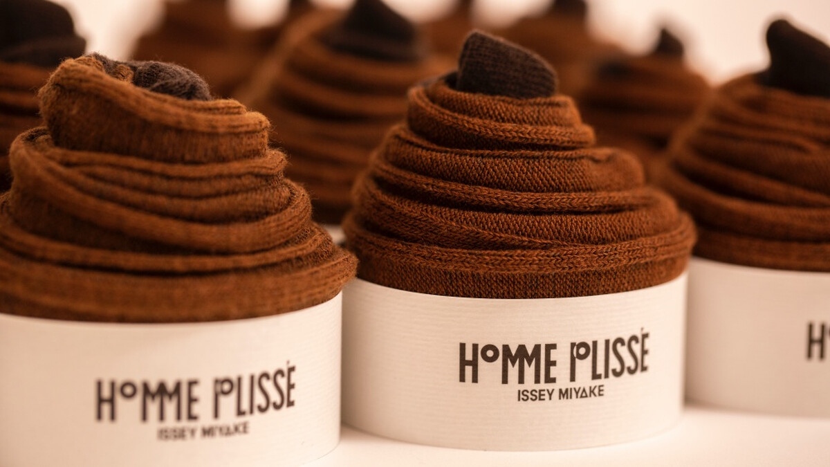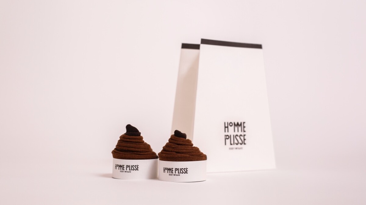 Homme Plissé Issey Miyake以獨特的3D織法,打造成立體造型的細長彩襪,並專門訂製特殊包裝,將襪子捲起後放入,就成了美味可口的肉桂捲彩襪,一個個彩襪排排站的畫面,宛如真正的肉桂捲,十分可愛俏皮。