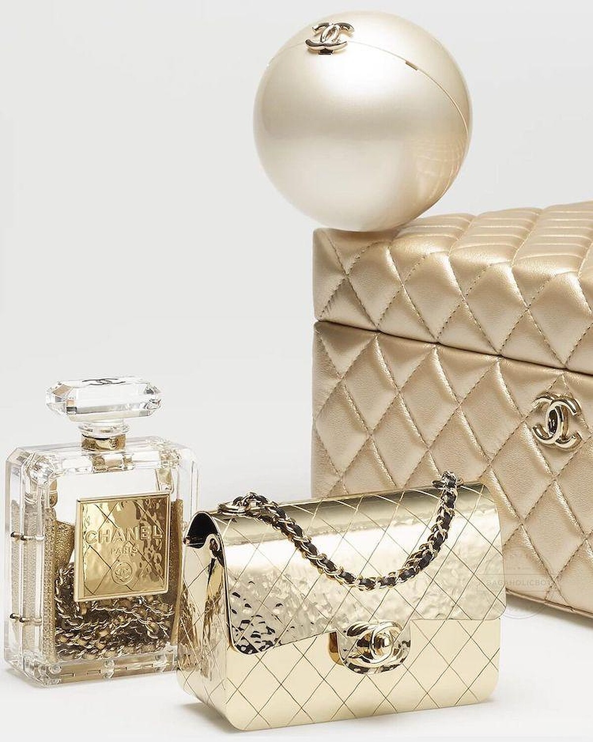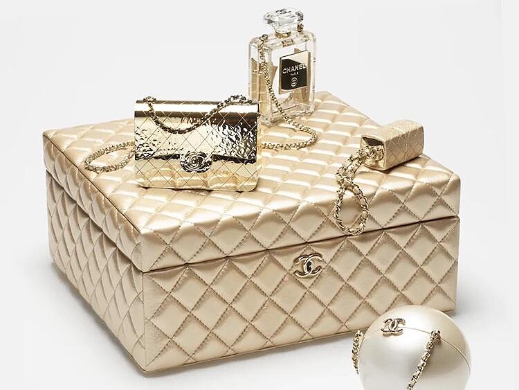 相隔兩年,香奈兒2022春夏系列再推出4盒1禮物盒,正確來說是珠寶盒,Chanel菱格紋方箱換穿奢華金外衣,打開盒中收齊品牌經典符碼,包括N°5香水、唇膏盒、珍珠球和小香迷必購入的11.12口蓋包,每一個單品都變成迷你小包,並換上耀眼的金色新裝。