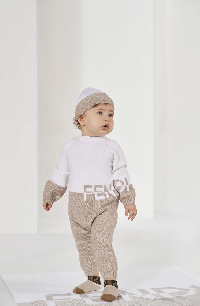 Fendi 2022童裝系列以溫暖奶茶色系貫穿,運用舒適棉質、柔軟針織、嘎別丁布料面料,綴以經典標誌Karligraphy、滿版FF Logo,當然也包括Fendi童裝系列的招牌玩偶和Fendirumi吉祥物,款式從剛滿月的新生兒,到年齡期的小朋友皆俱全。