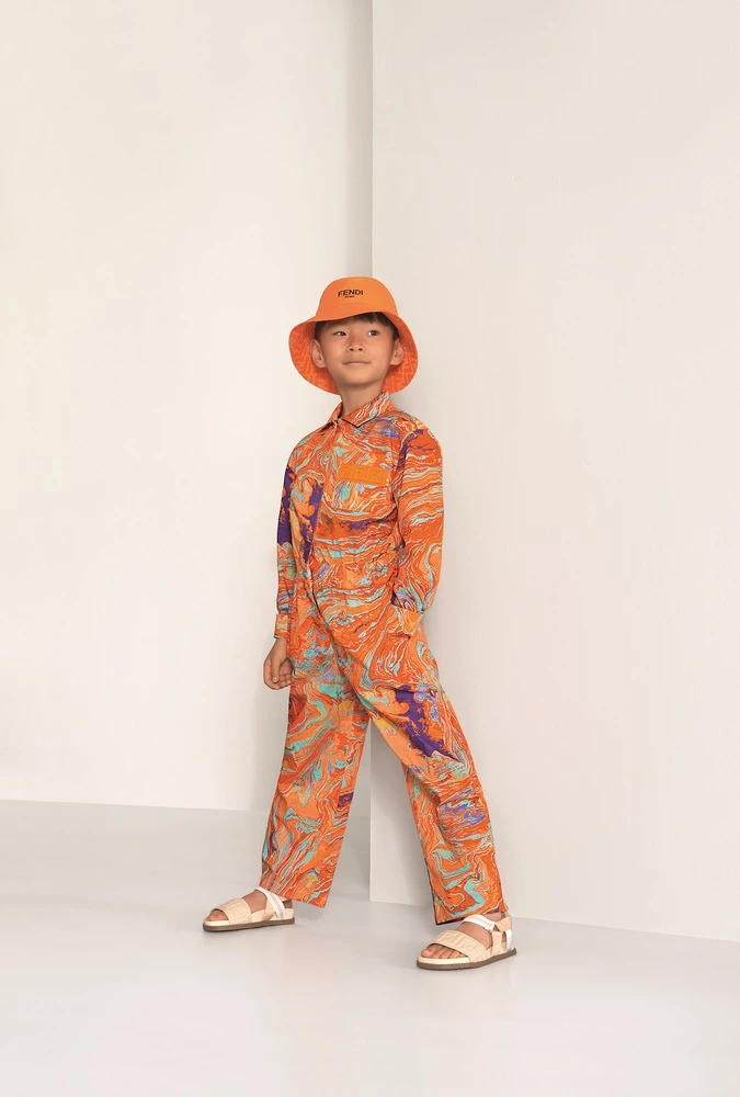 男女生童裝系列延續溫柔奶茶色系,綴以荷葉邊設計,推出風衣夾克、長褲,值得一提的是,Fendi 2022春夏女裝系列的渲染大理石紋設計,則推出小男生的連身褲裝。