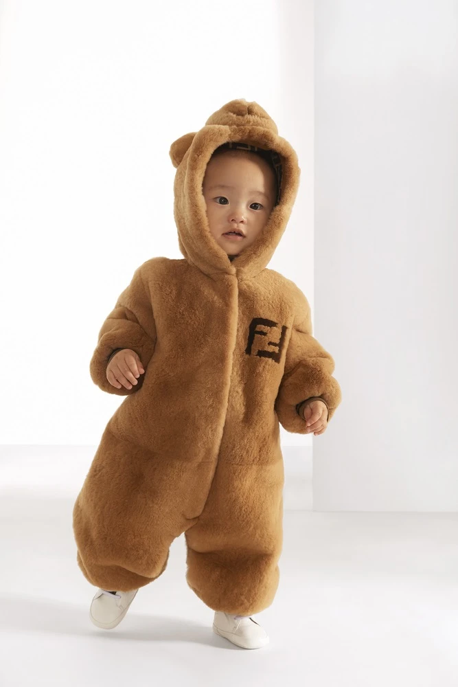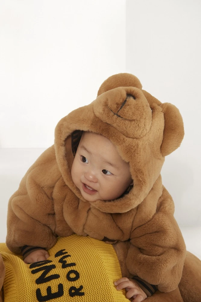 新生兒系列以吸睛的亮黃色、海軍藍為主軸,推出針織條紋連身衣,在胸前特別縫製FENDI標誌。最讓人心動的,是泰迪熊造型的絨毛帽連身衣,衣服上的連帽款式,真的是小熊的形狀,家中小小孩一穿上吸睛度滿分。