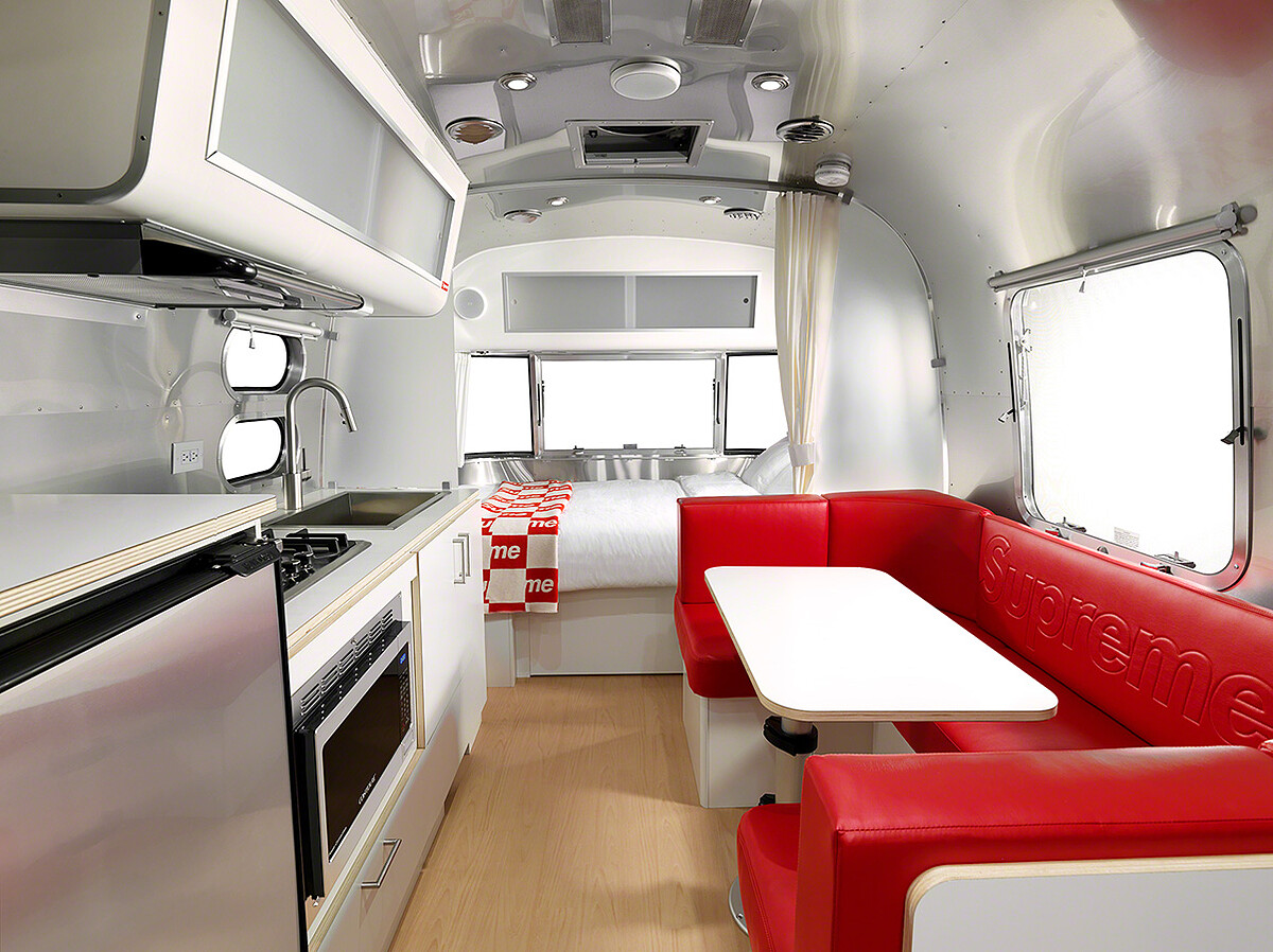這回與Supreme的聯名,是以Airstream Bambi 22車型為藍圖,拖車外觀保留銀色彈頭設計,並換上顯眼的Supreme遮陽棚。