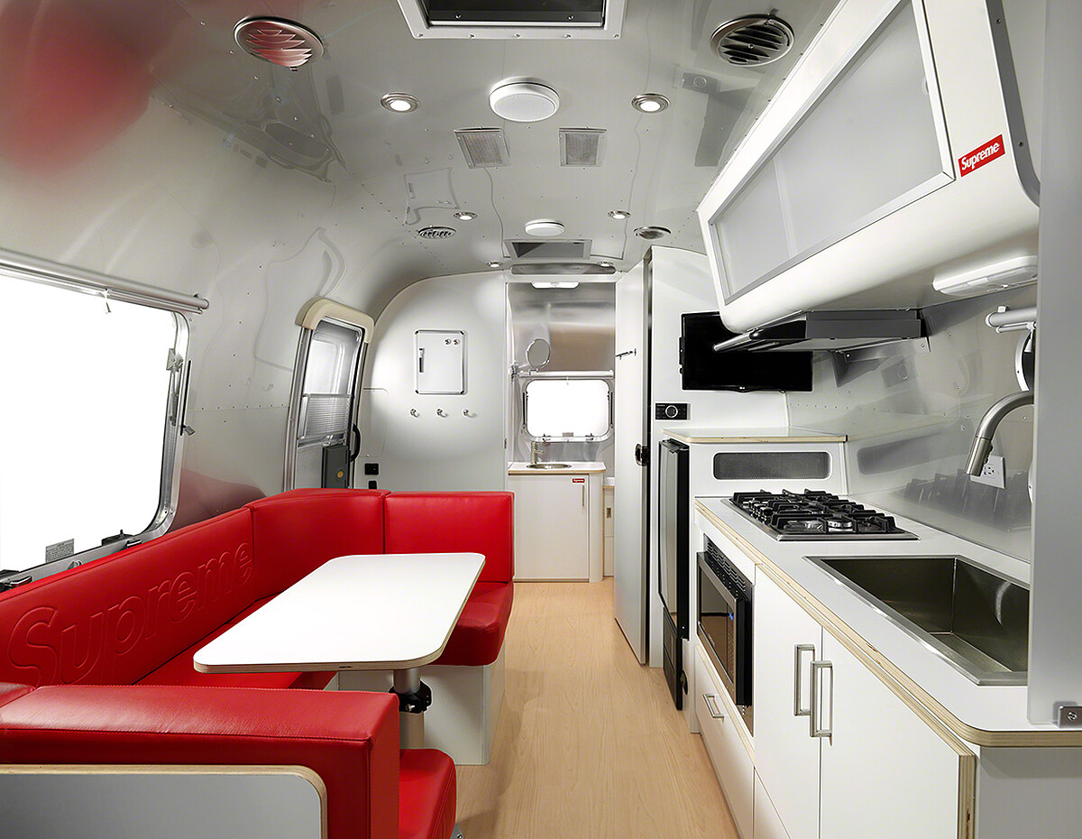 拖車的內裝更是精彩,飯廳的沙發採用標誌性的Supreme紅色皮革,壓印上偌大的logo字樣,紅白配色宛如置身於美式餐廳、賦予露營不一樣的用餐氛圍。飯廳兩側分別為臥室和浴室,皆能看到Supreme的紅色標籤點綴。