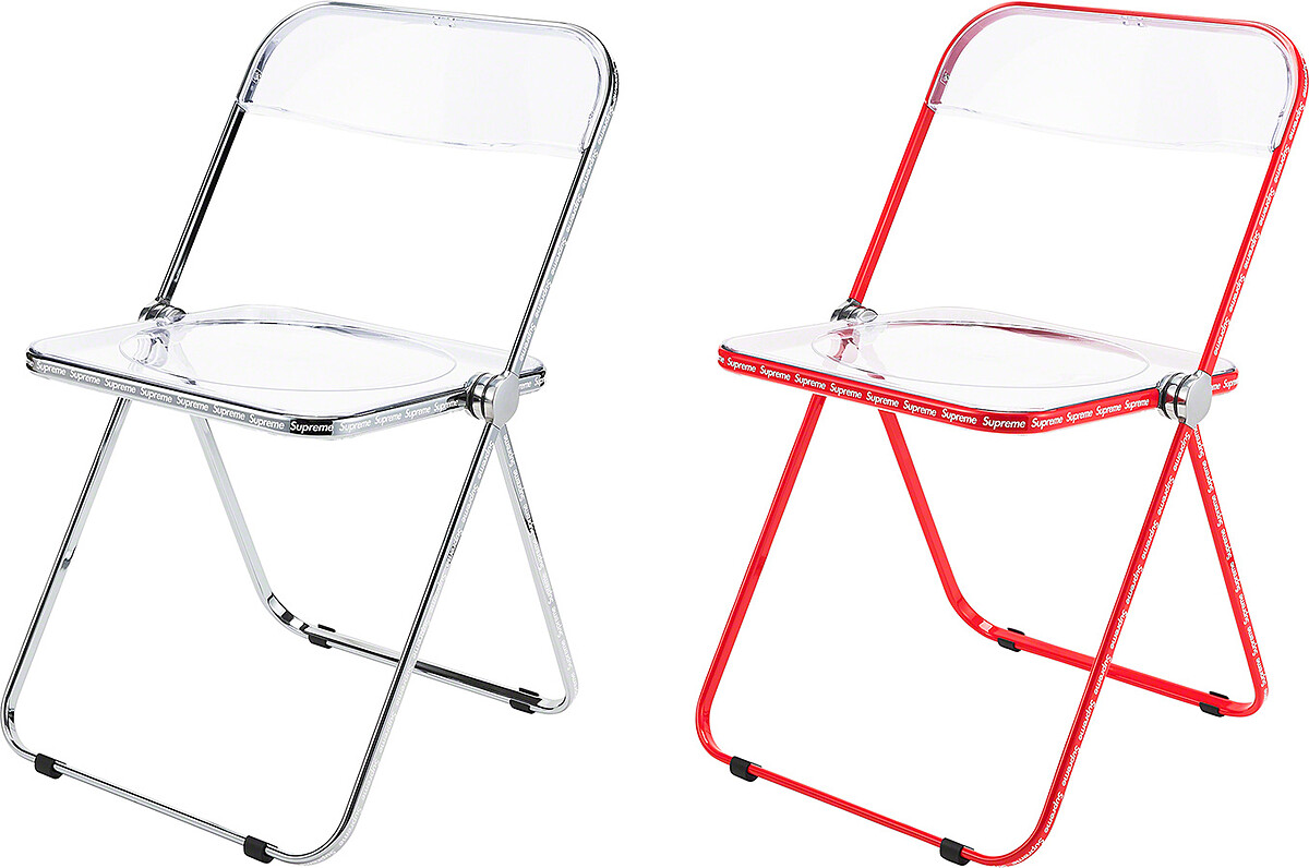 來自義大利家飾品牌Anonima Castelli的Plia折疊椅首次於1967年在米蘭家具展上首次露出,當時因為「三片式樞軸」的創新細節而大受歡迎,是設計師Giancarlo Piretti最具知名度的代表作之一。大面積的療癒透視感壓克力,在椅子的邊框重複落上Supreme字樣,推出銀、紅兩色。