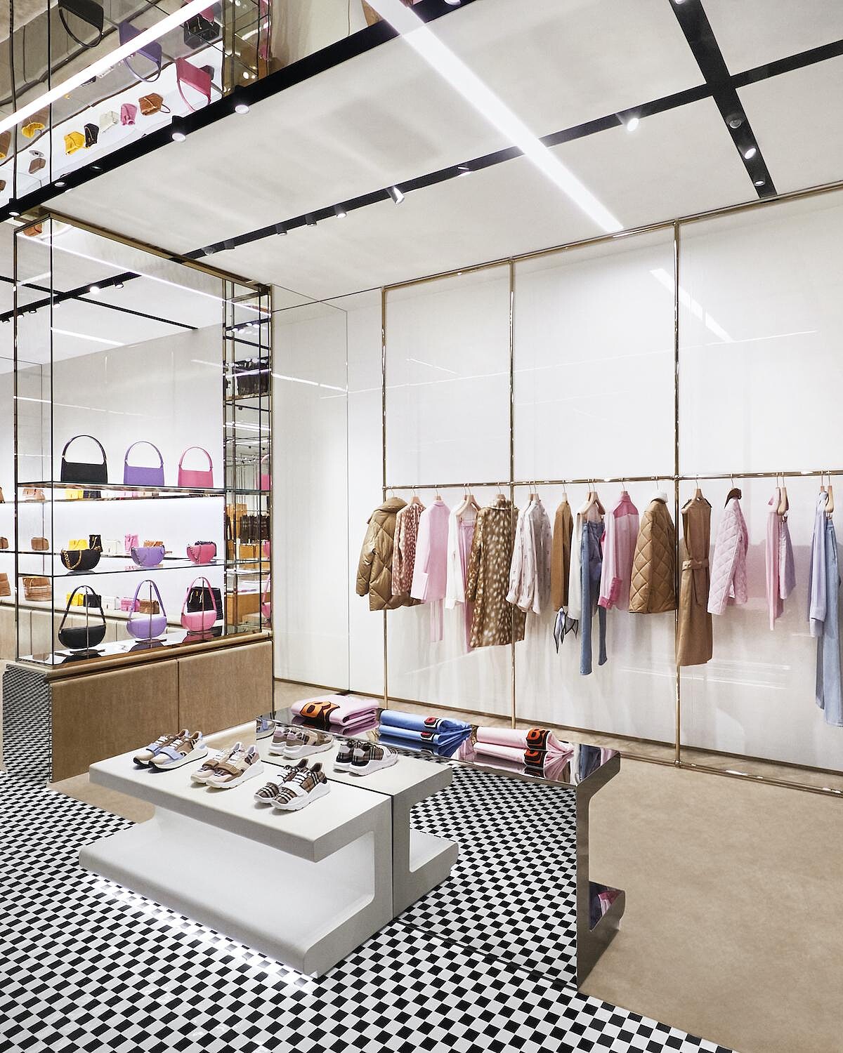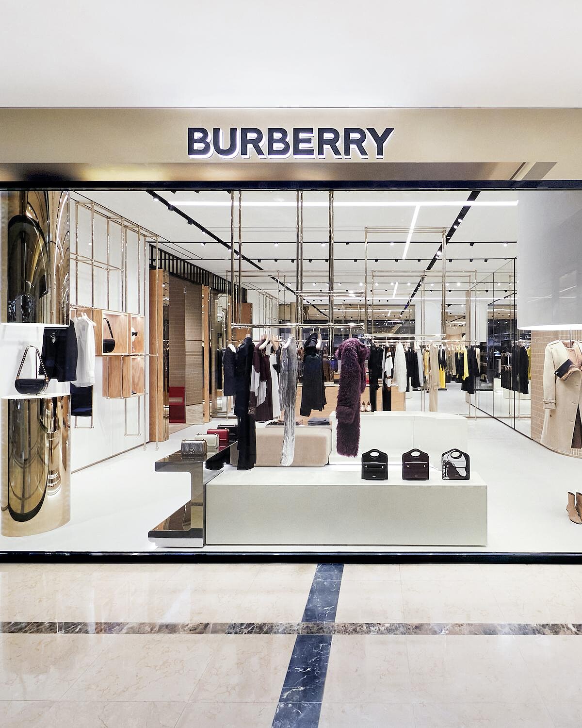 黑、白、紅與蜜金四色已成為Burberry的標準配色,一進店就能看到以上顏色的裝潢元素,例如黑白交錯的地磚、蜜金色的牆面磁磚⋯⋯。天花板也透過燈條與簍空的設計來重現Burberry的經典格紋圖樣。除此之外,店內採用大量的鏡面版材,讓整體的購物空間自視覺上看起來更為寬敞、舒心。