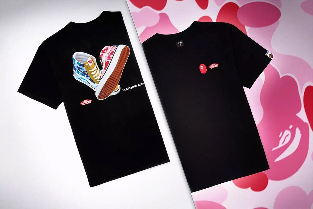 此番,Vans和BAPE®推出黑、白兩色T-Shirt,背面為繽紛配色的Sk8-Hi 38 DX鞋款設計,正面則是雙方的品牌標誌。