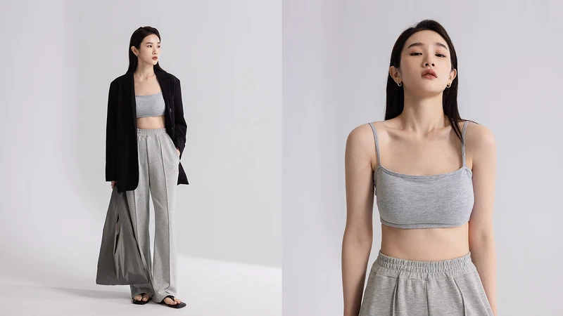 MEIER.Q使用親膚柔棉面料所打造的細肩帶短版平口BRA TOP廣受女生歡迎,能夠簡單穿出門,同時應對運動需求也沒問題,肩帶有彈性不緊繃,領口下襬是採用鬆緊帶設計,即使一整天穿著也不會感到緊勒,搭配同樣棉質的運動長褲,外搭則是配上正式俐落風格的西裝外套,讓穿搭不會過於休閒,而是掌握了良好的Mix & Match法則混搭出時尚感。