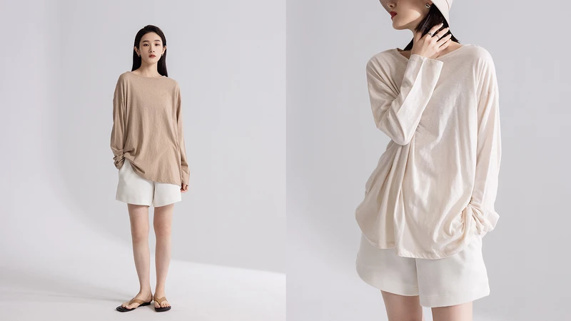 週末的下午,留給自己一段放鬆慢活的時光,穿上寬鬆舒適、以質感米色系為主的輕薄雜紋理透膚長袖T衛衣,讓親柔透膚布料與寬鬆落肩剪裁版型,營造出日常居家生活的優雅氛圍,隨性搭配休閒短褲,即使臨時外出也不會有睡衣即視感,這樣的愜意悠遊寬鬆OVERSIZE的時髦家居著裝,使週末ME TIME更顯細膩精緻品味。