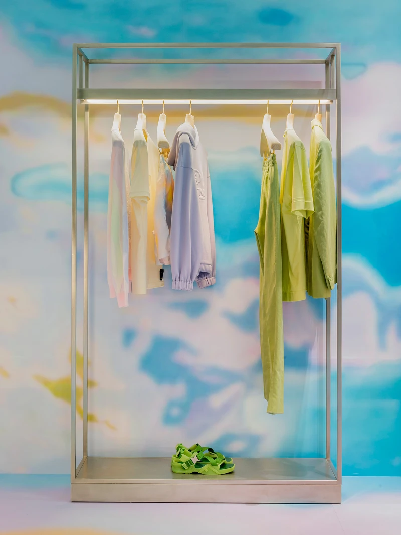座落於台中新光三越二樓的期間限定店,擷取2022春夏系列之中的薰衣草紫、冰晶藍與開心果綠,渲染於整家店鋪。浪漫的紮染背景,襯以極簡的銀白色展示架,視覺上看起來相當寬敞、舒心。