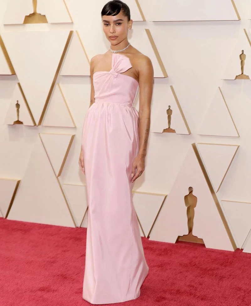 近乎白色的淡粉色,柔伊克拉維茲選擇Saint Laurent的訂製禮服出席本屆典禮。俐落直筒的剪裁,於胸口之處以蝴蝶結點綴,禮服的婉約氣質和貓女的率性風格形成對比。