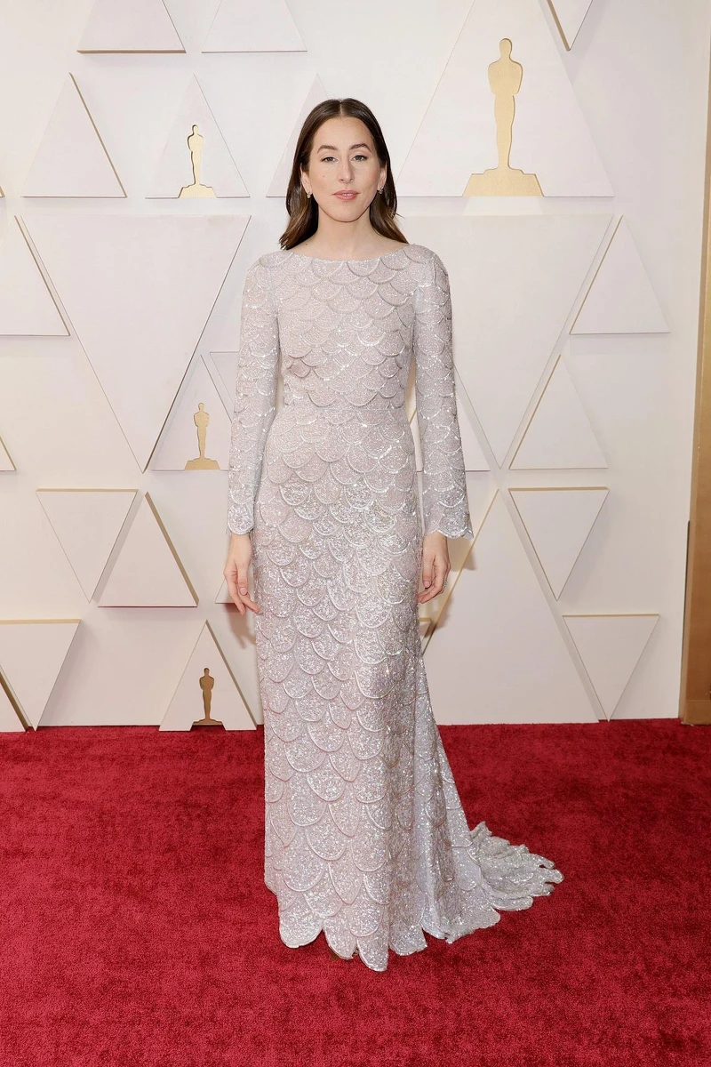艾拉娜海姆原與姐妹共組樂團Haim,去年以電影《甘草比薩》(Licorice Pizza)在影劇圈打開知名度。穿上Louis Vuitton訂製絲質亮片刺繡魚尾禮服,呼應魚尾剪裁,禮服上的刺繡以波紋狀的魚鱗呈現。佩戴LV高級珠寶系列當中的白金鑲鑽耳環與戒指,清新氣質又不失貴氣。