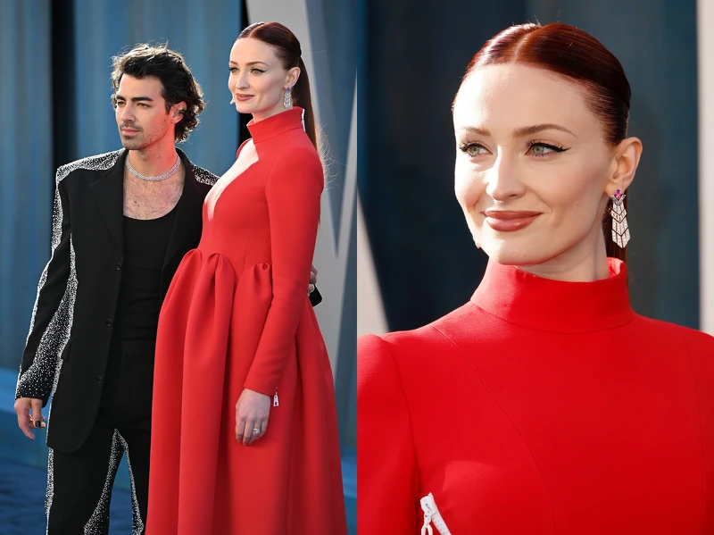 夫妻檔蘇菲特納+喬強納斯連袂出席奧斯卡的慶功派對,身穿友好品牌Louis Vuitton的訂製服,喬強納斯為一套水鑽刺繡的黑色西裝套裝;懷有身孕的蘇菲特納則選擇喜氣的紅色高領禮服,展現出孕婦獨有的好氣色光彩。