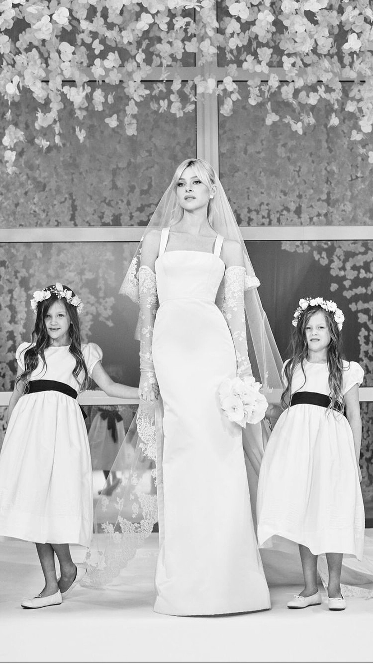 貝克漢一家向來是時尚界的寵兒,David Beckham與兩位兒子Romeo、Cruz皆以經典的黑色西裝出席;Victoria Beckham選擇一件灰藍色調的緞面細肩帶禮服,展現一貫的極簡、俐落風格;妹妹Harper則擔任婚禮上的花僮角色,白色公主袖洋裝,用黑色緞帶蝴蝶結點綴在腰間,頂上白色玫瑰花圈頭飾展現可愛的兒童活力。