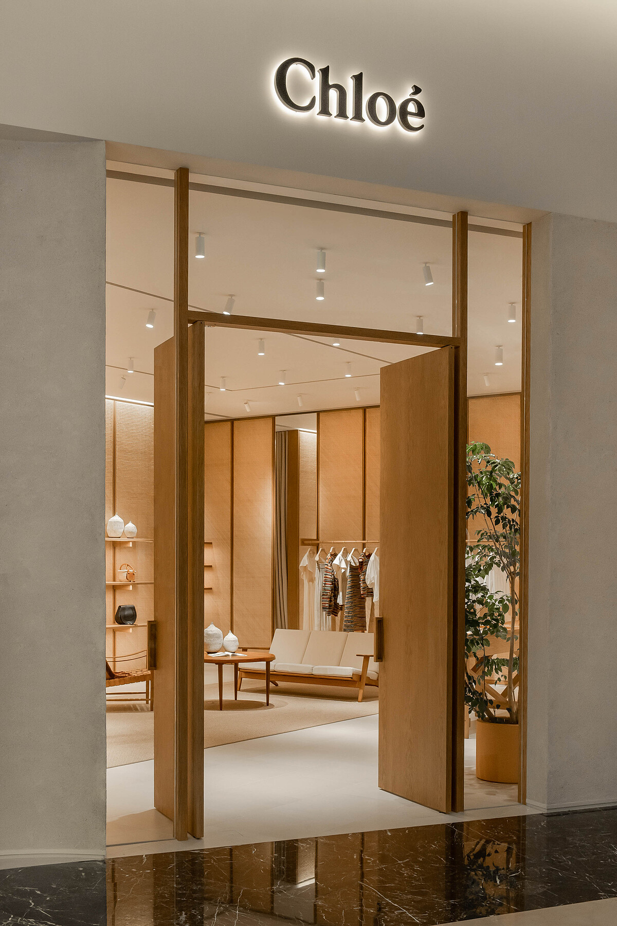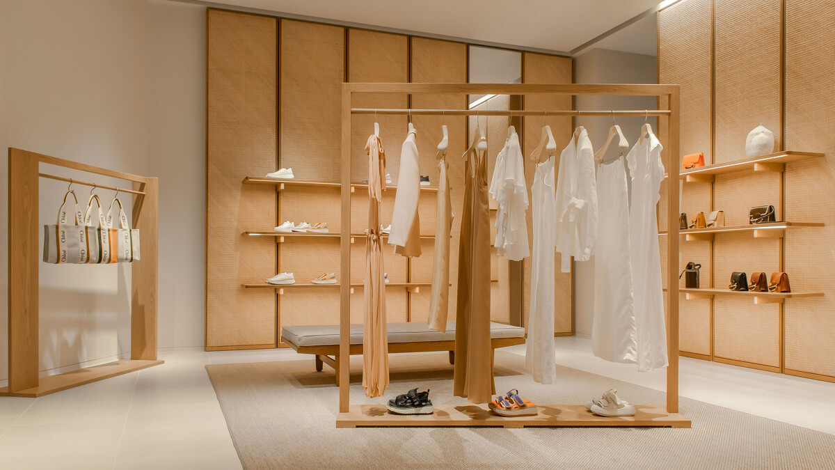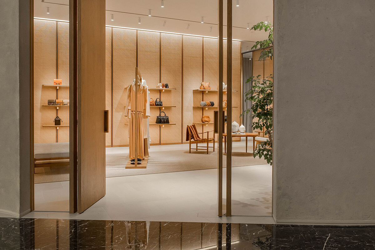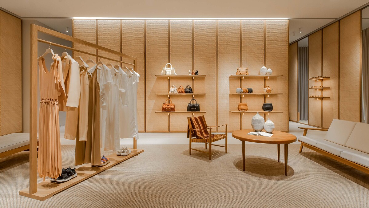 過往Chloé多以玻璃作為的門面,首次換上實心外牆設計,運用天然纖維與灰土為原料的建材,透過工匠耐心磨製出天然石壁的質樸效果,有點像近年興起的侘寂裝潢風格,給人一絲自然的療癒力量。