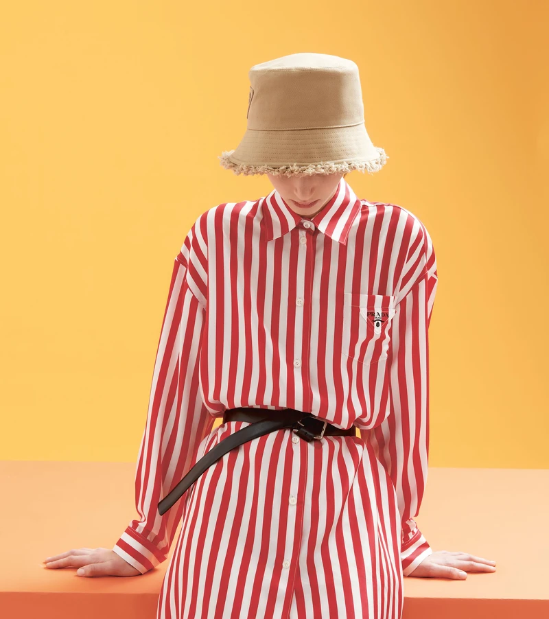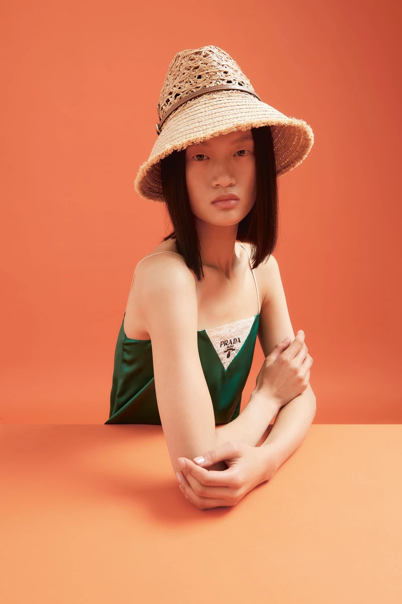 炎熱的夏日,定不能少一頂遮陽帽,Prada經典三角標誌同樣用以編織技法登場。