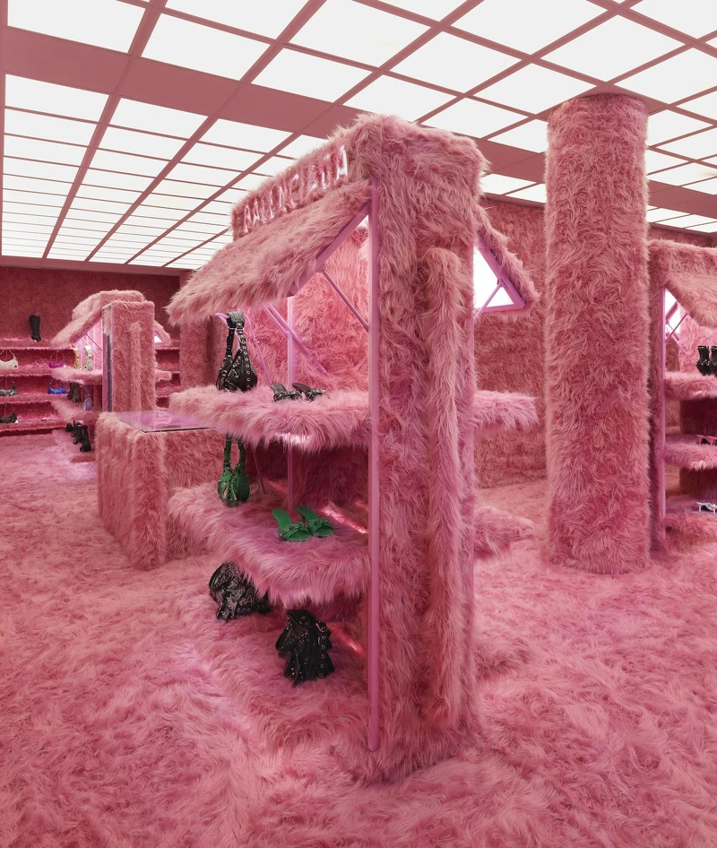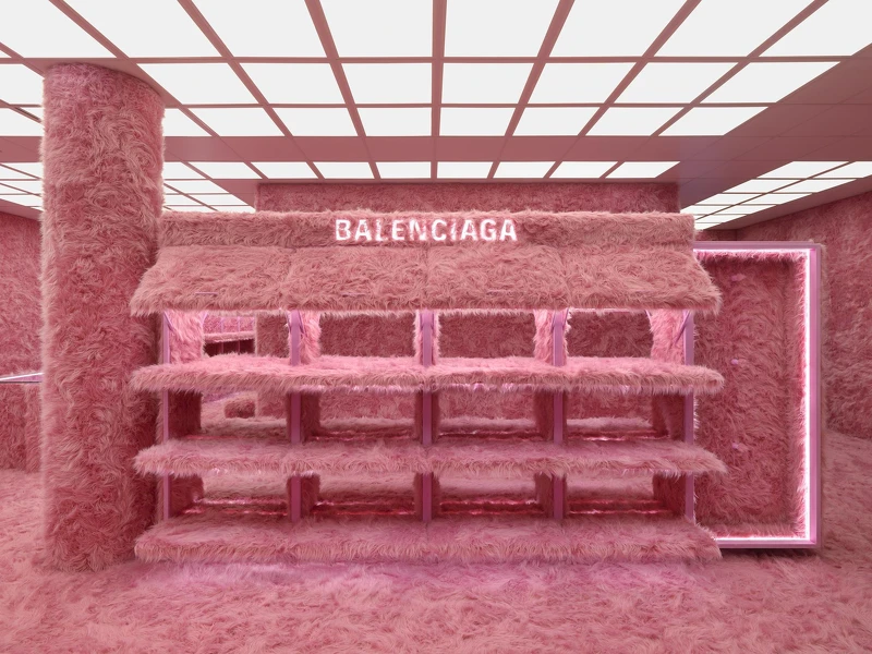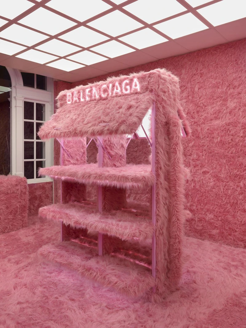 除了本地的客製化巡迴服務,特別為了Le Cagole可頌包設計的期間限定的全新店裝!可頌包因著大量的鉚釘與、皺摺與編織皮革的設計,被視為「極繁主義」下的產物,Le Cagole期間限定店裝也承襲了這樣的概念,Balenciaga便在大舉把店內所有的層架、座椅、柱子和地板鋪上粉紅色的絨毛,將極繁主義境界帶到另一個層次。Le Cagole期間限定店首播先行在倫敦Balenciaga實體店登場,爾後將陸續出現在各國店面!