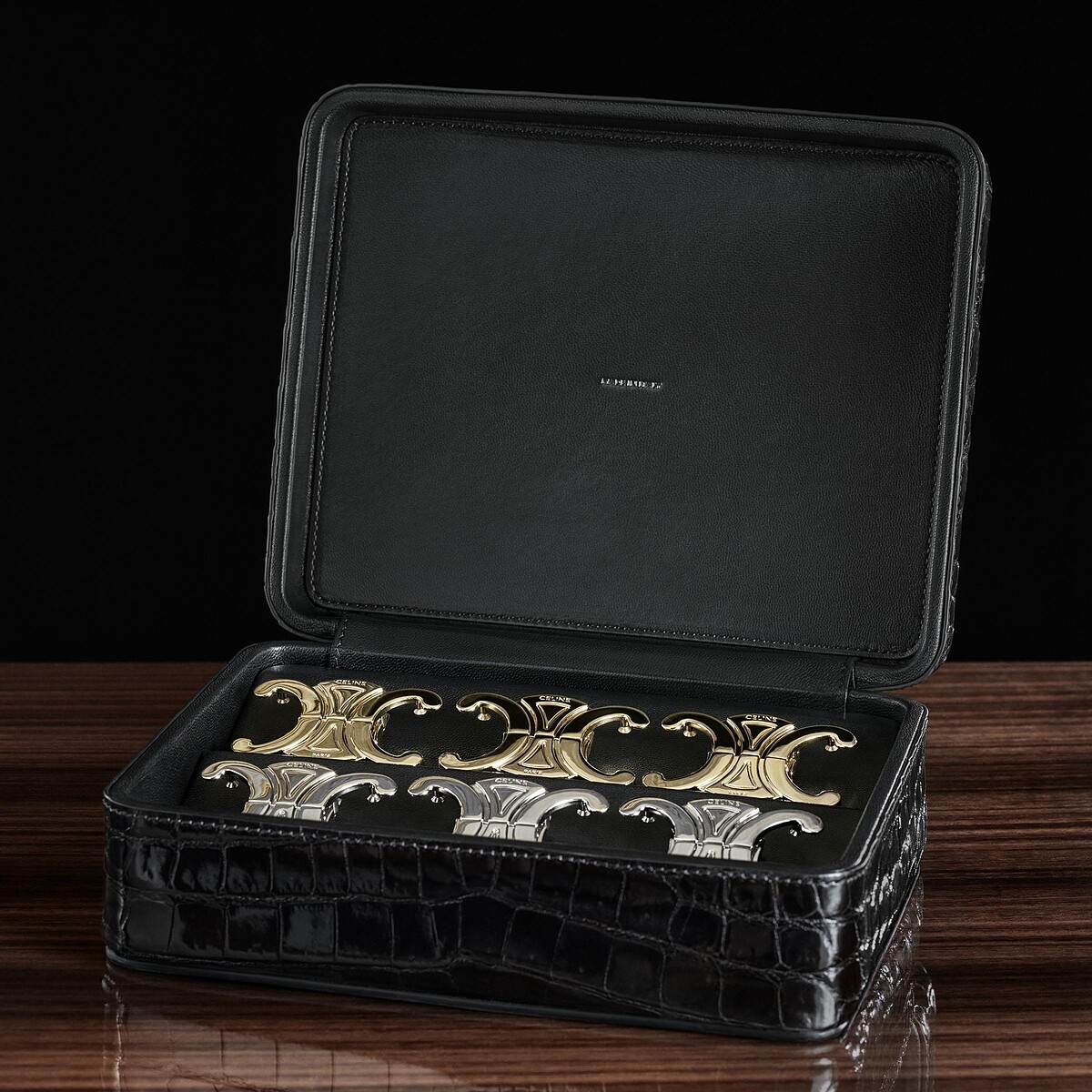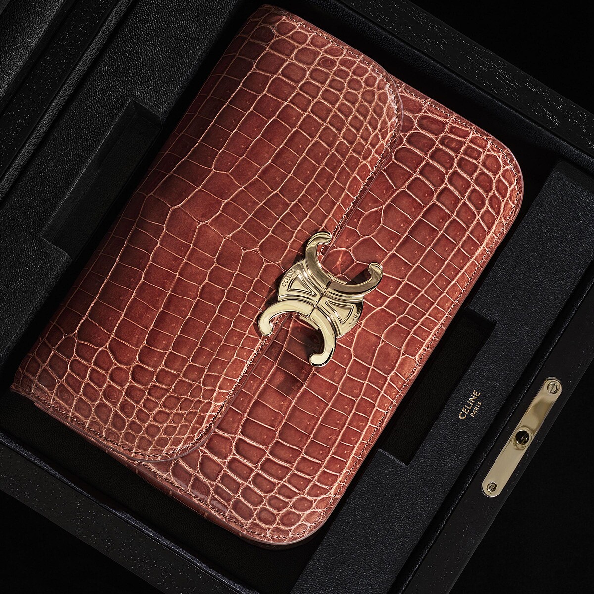 重新演繹凱旋門鎖鏈圖案的Triomphe包,在高級訂製系列中,換上尼祿鱷魚皮革、光滑山羊皮製作,同樣附有一面鱷魚皮包邊的鏡子,燙印CELINE Haute Maroquinerie品牌標識,從接受訂製到完成,需花費長達12個小時。