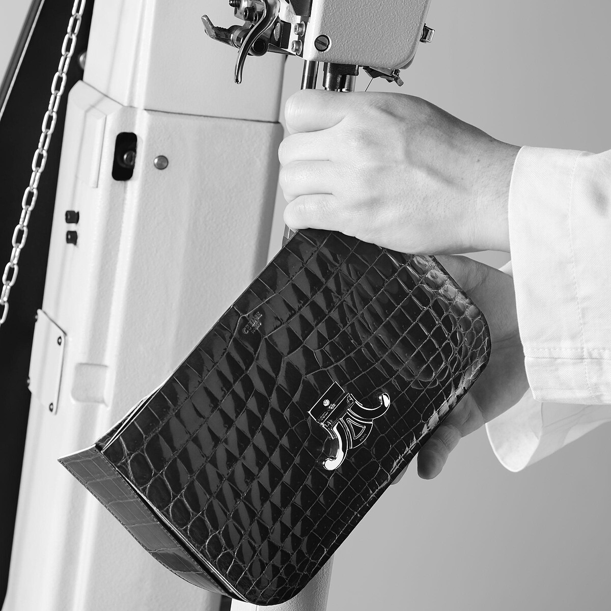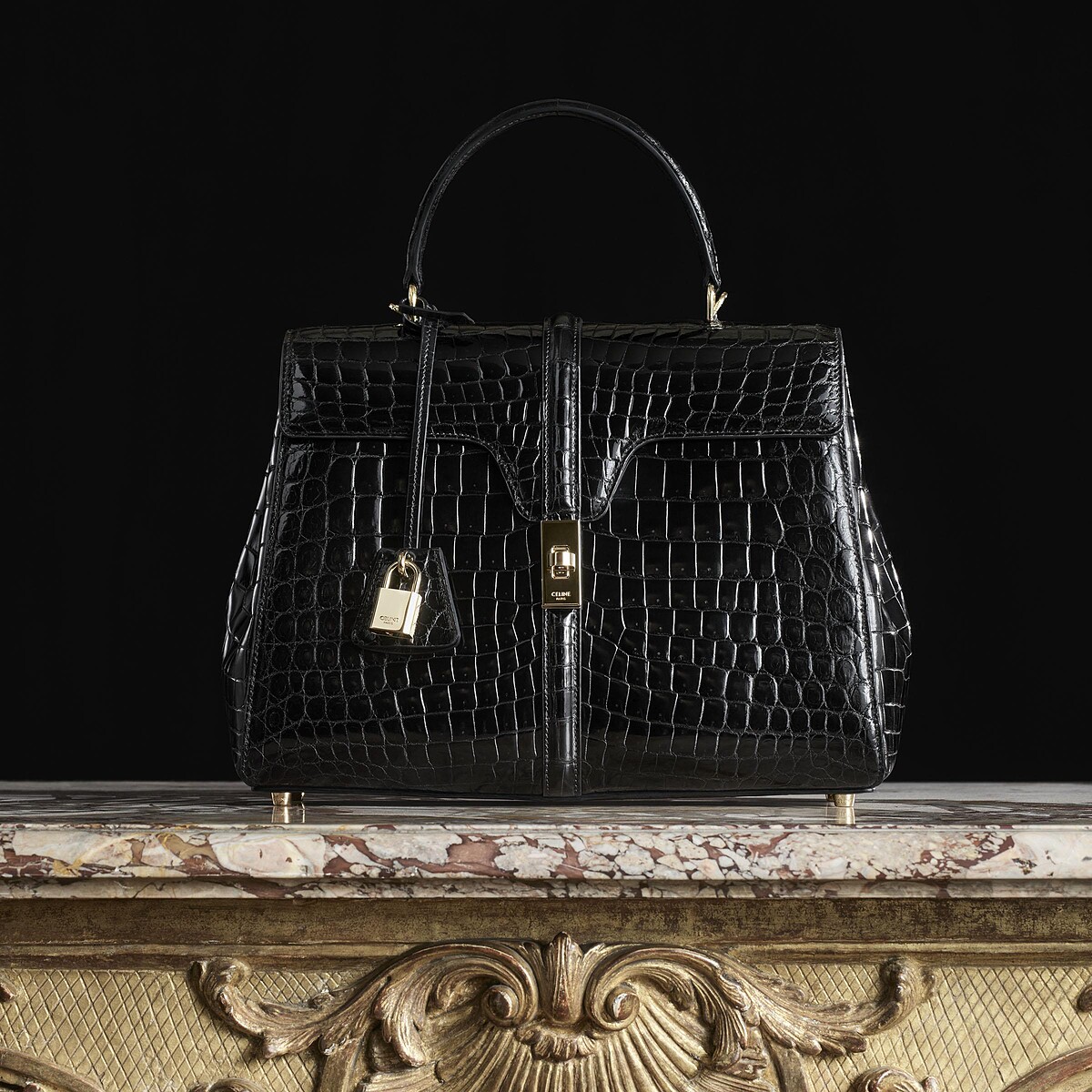 源自巴黎16 Rue Vivier工坊的CELINE 16,是Hedi Slimane入主CELINE後為品牌打造的第一個包款,透過Maroquinerie高級訂製系列,16包外觀改以大橢圓形鱗片聞名的尼祿鱷魚皮革亮相,搭配光滑山羊皮革內襯,並附有一面由鱷魚皮打造的鏡子,上面燙印CELINE Haute Maroquinerie品牌標誌,從開始到成品需花費17個小時才能完工。