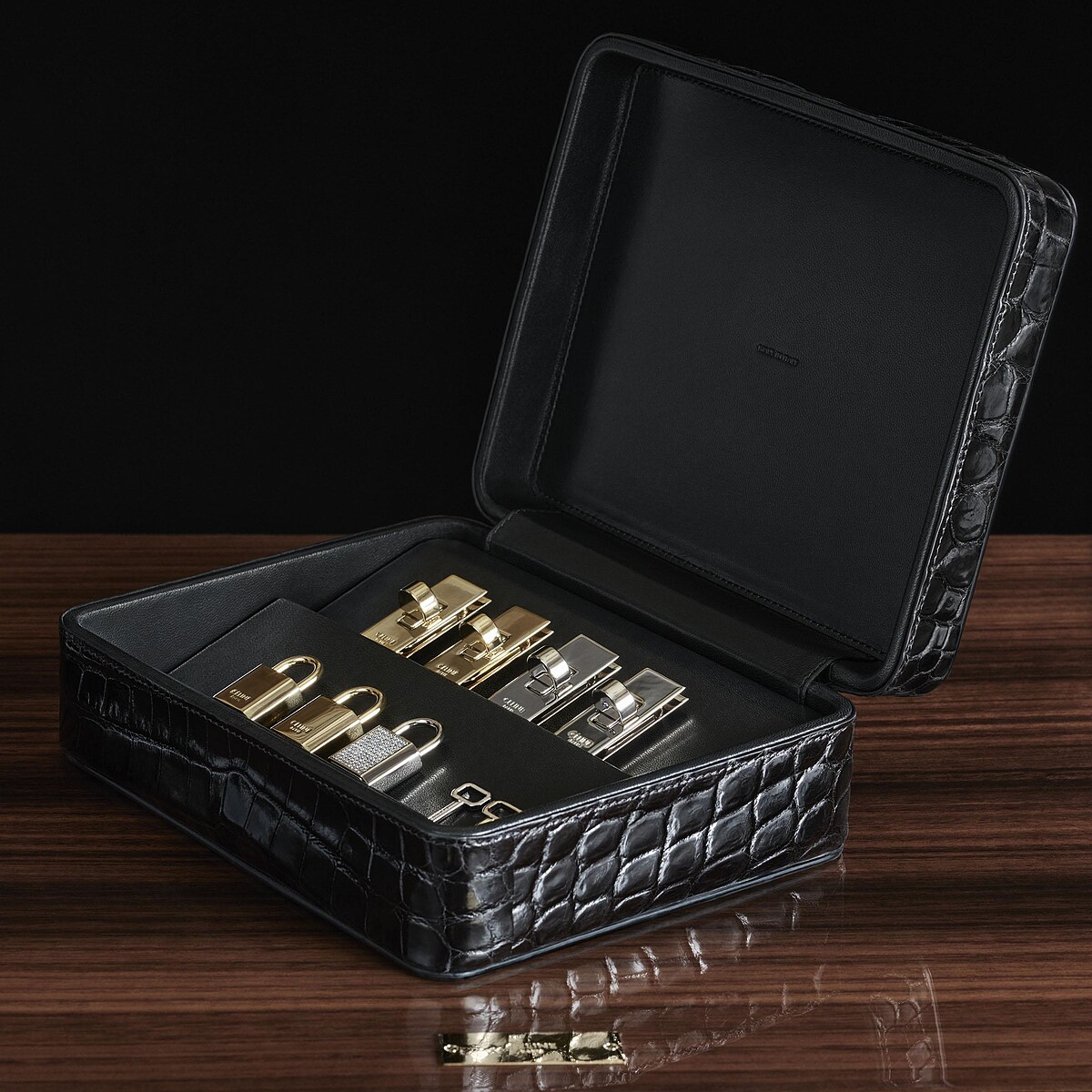 除了兩大經典包款外,CELINE還推出La Bijouterie小配件珠寶箱,精心挑選18 克拉白金或黃金的材質,打造手袋上的細緻小配件,包括開合旋釦、鎖頭、鑰匙等,還可以在Triomphe鎖釦上鑲嵌鑽石,裝著細緻小配件的珠寶箱,都用以和包款相同的皮革包覆,強調CELINE Maroquinerie高級訂製系列的完整性。