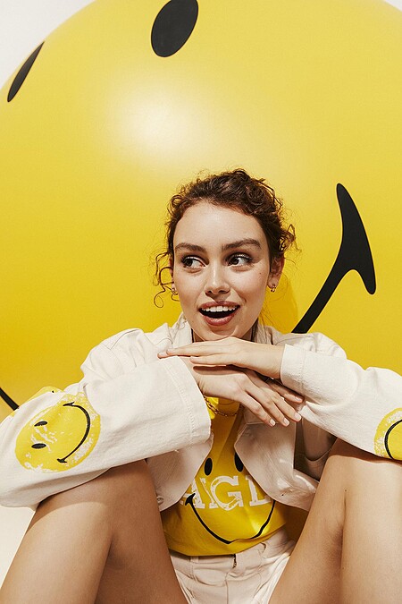 男、女都能穿的中性版型休閒外套,特別在袖子、胸前加入Smiley標誌。